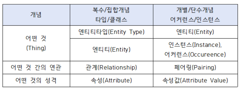 - 특징: 업무에 관한 키, 속성, 관계등을 표현, 재사용성 높음 / 구체적
