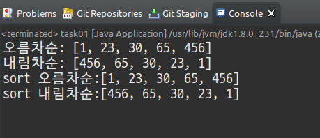 먼저 ArrayList에 값을 넣어 주었다. 숫자는 아무렇게나 넣어 주었다. (30, 1, 23, 456, 65를 넣었음)