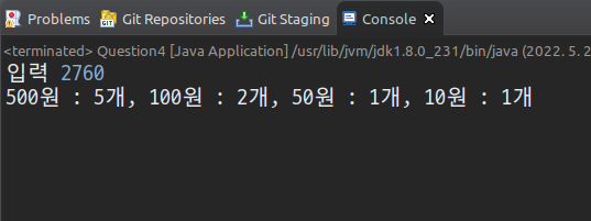 예시 : 입력 2760 -> 출력 :: 500원 : 5개 , 100원 2개, 50원 1개, 10원 1개