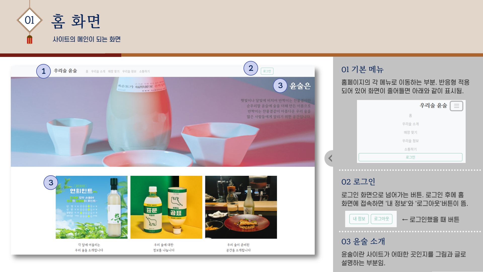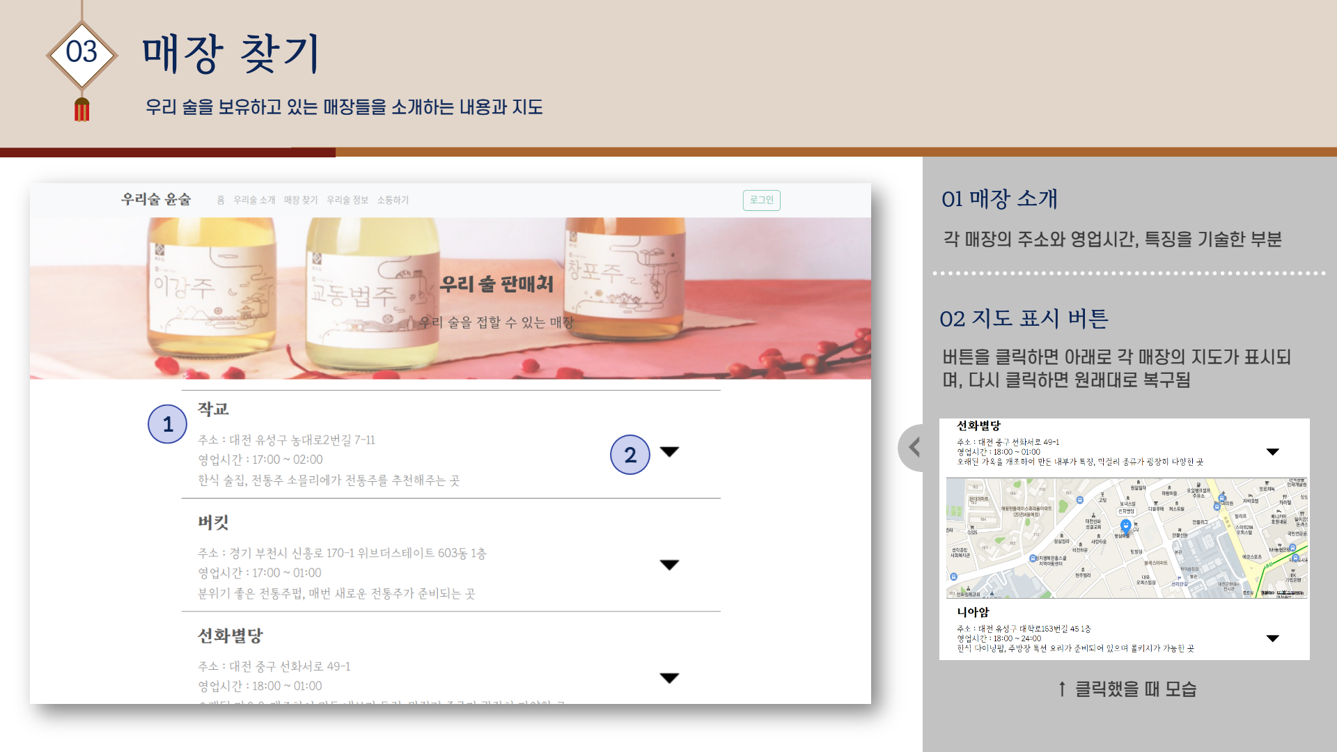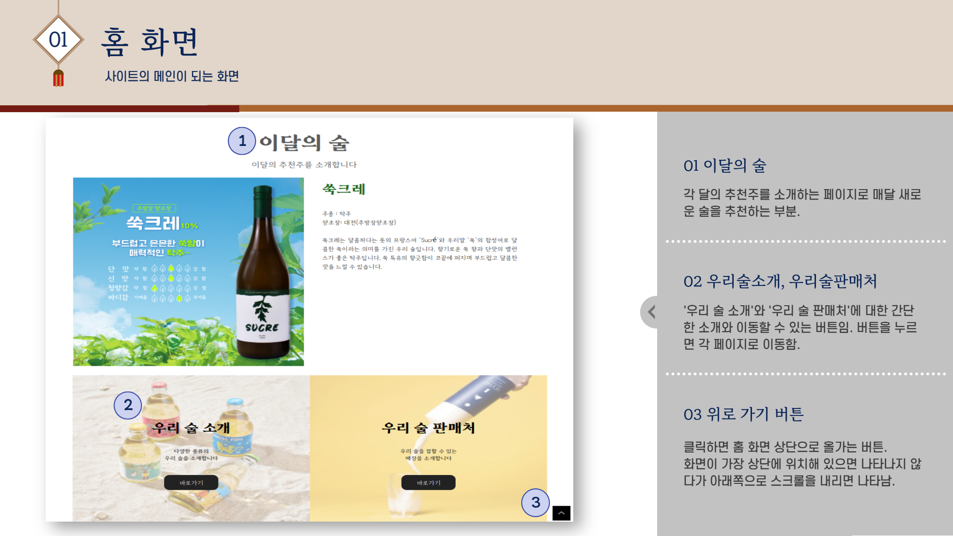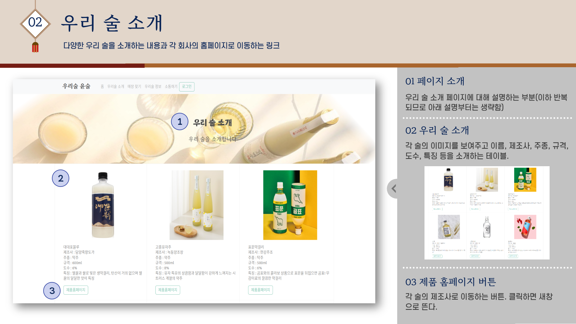4. 재밌었던 점 : 평소 관심 있었던 전통주를 주제로 홈페이지를 만들 수 있어서 재미있었다. 머릿속으로 구상한 내용을 화면으로 최대한 표현해냈고 수업시간에 배웠던 Ajax나 API도 다양하게 활용하여 수업시간에 배웠던 내용을 다시 복습하는 시간이 되었다.