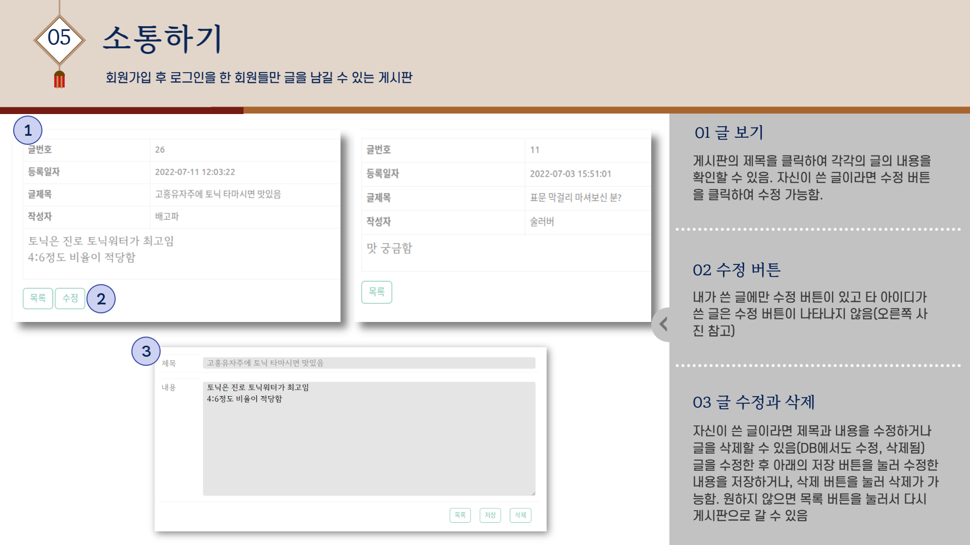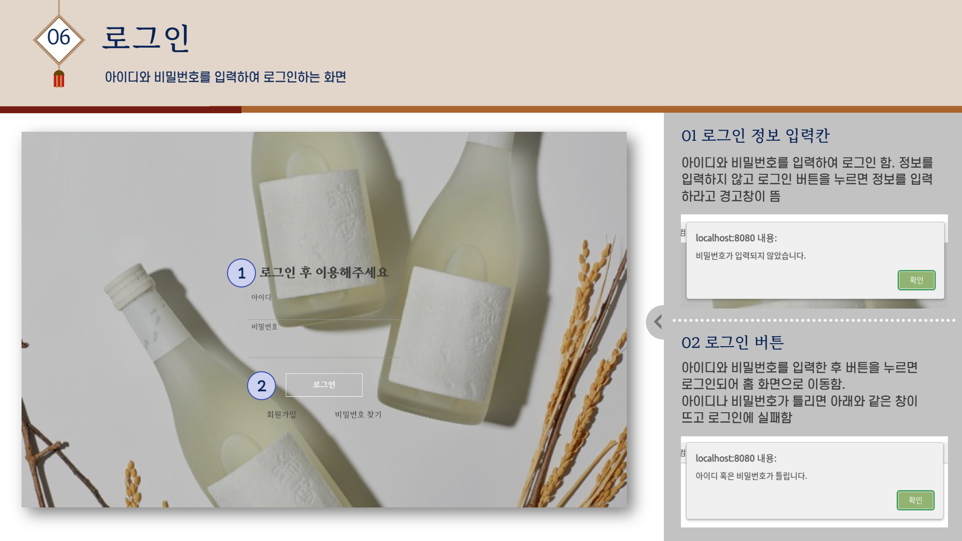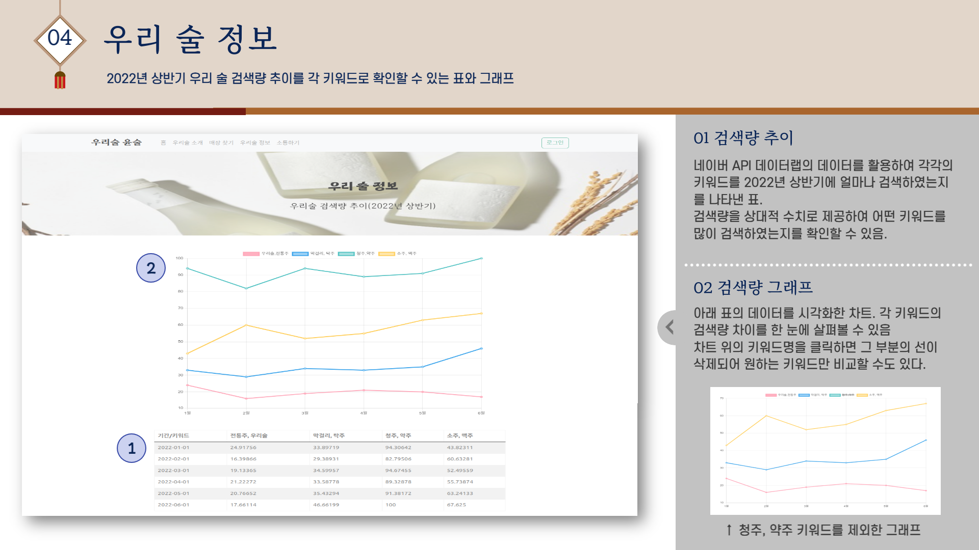 4. 재밌었던 점 : 평소 관심 있었던 전통주를 주제로 홈페이지를 만들 수 있어서 재미있었다. 머릿속으로 구상한 내용을 화면으로 최대한 표현해냈고 수업시간에 배웠던 Ajax나 API도 다양하게 활용하여 수업시간에 배웠던 내용을 다시 복습하는 시간이 되었다.