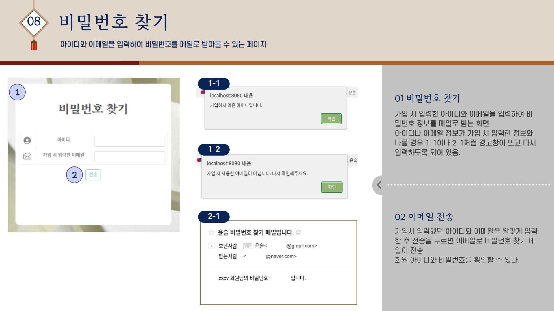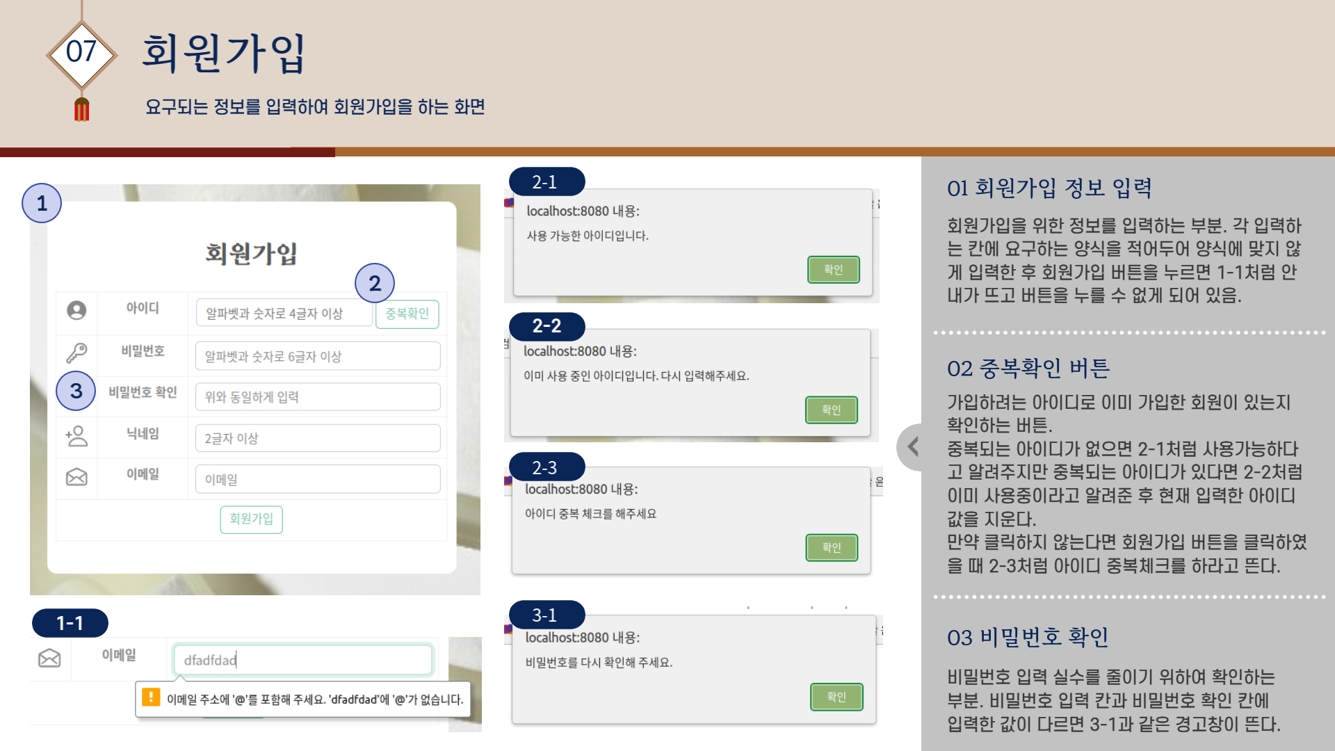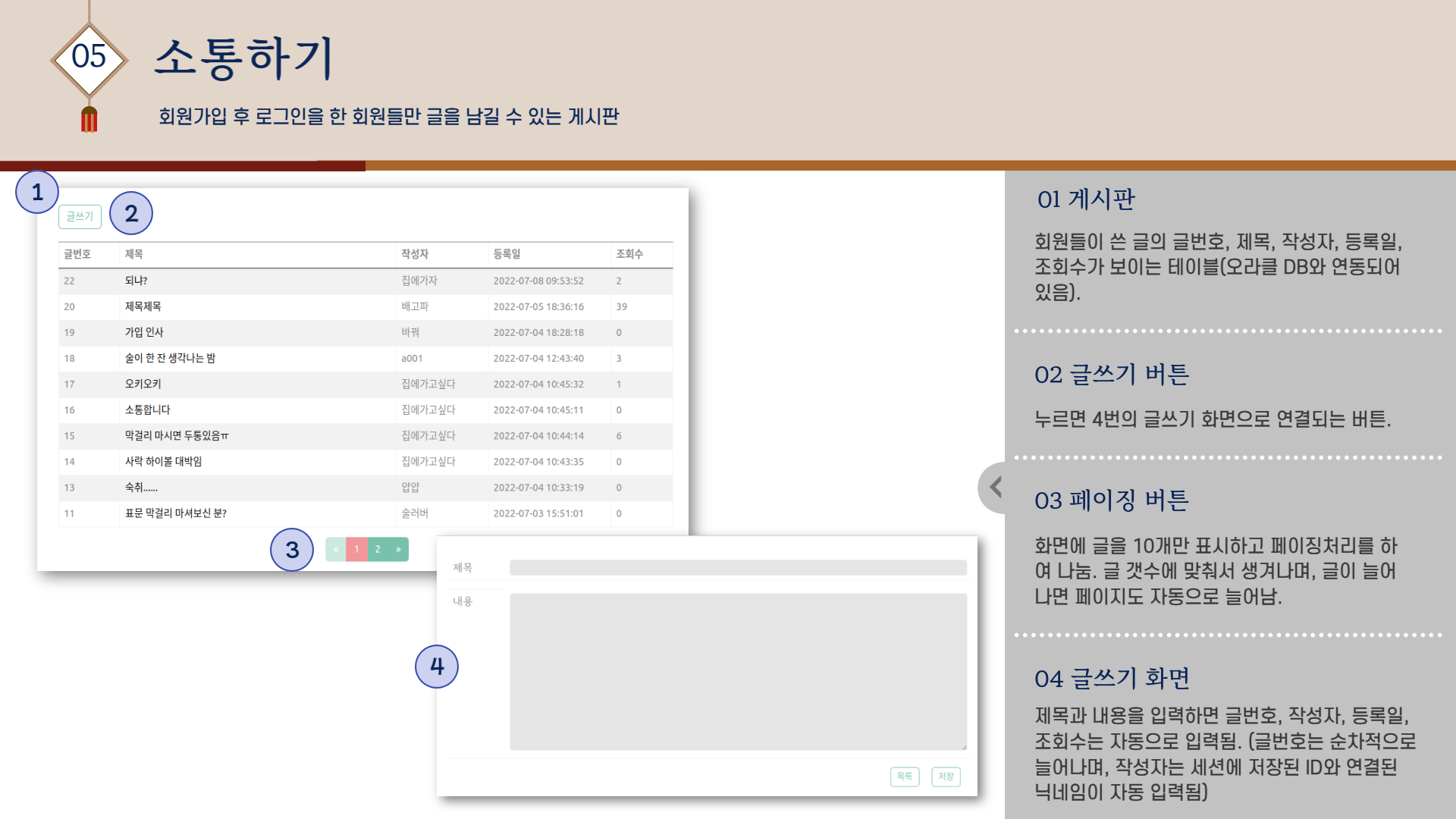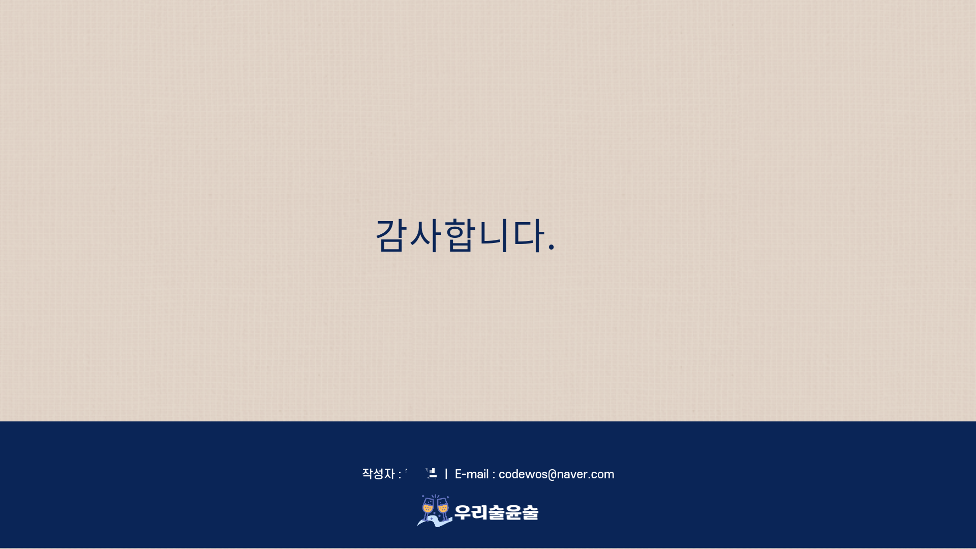 4. 재밌었던 점 : 평소 관심 있었던 전통주를 주제로 홈페이지를 만들 수 있어서 재미있었다. 머릿속으로 구상한 내용을 화면으로 최대한 표현해냈고 수업시간에 배웠던 Ajax나 API도 다양하게 활용하여 수업시간에 배웠던 내용을 다시 복습하는 시간이 되었다.