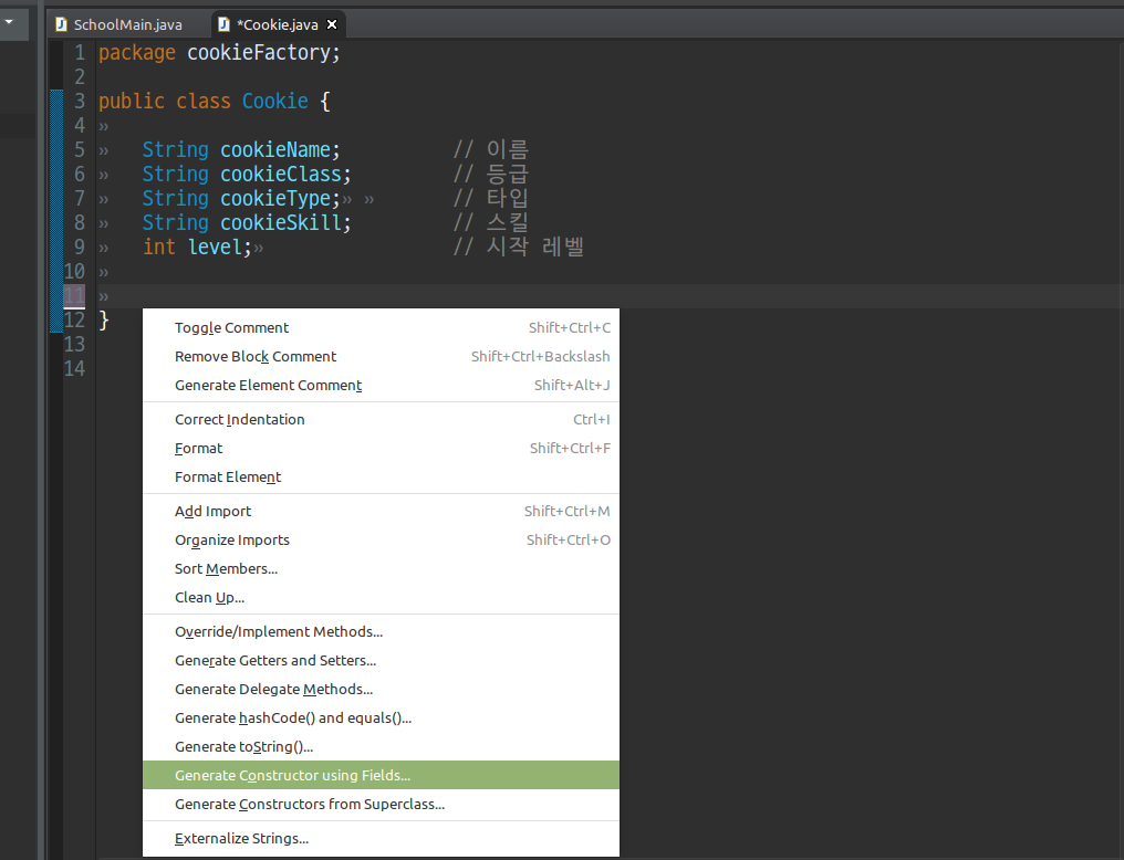 위의 코드를 살펴보자. 내가 설정한 값에 따르면 쿠키를 만들 때는 이름, 등급, 타입, 스킬, 시작 레벨을 설정해줘야 한다. 또한 다른 클래스에서도 사용할 수 있도록 만들어 주었는데 Alt+Shift+S를 누르면 아래 사진처럼 메뉴가 뜨고 이 중에서 'Generate Constructor using Fields'를 클릭하면 쉽게 만들 수 있다.