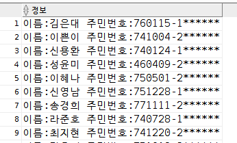 문제1 : memeber 테이블의 고객 정보를 "이름 : ㅇㅇㅇ, 주민번호 : 760115-1****** "로 각각이 한 컬럼에 나오게 출력하시오