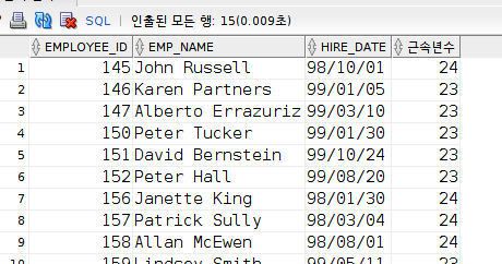 ,to_char(SYSDATE, 'YYYY') - TO_char(hire_date,'YYYY') as 근속년수