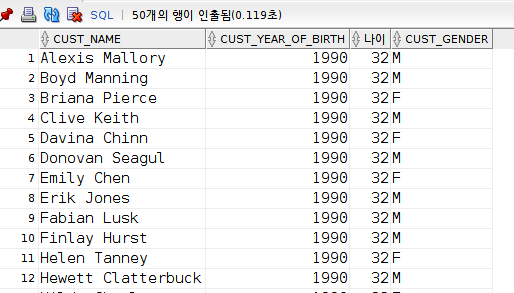 ,to_char(SYSDATE, 'YYYY') - TO_char(cust_year_of_birth) as 나이