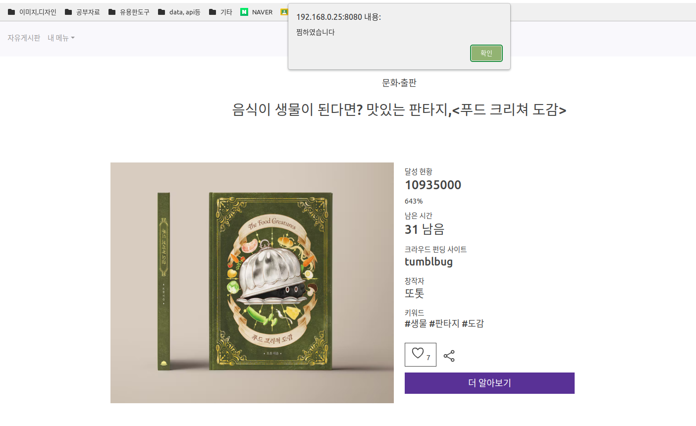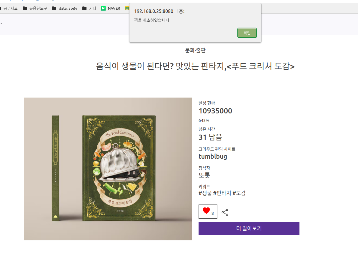 하트를 누르면 찜하기가 되어서 DB에 저장되며 '나의 펀딩'에서 확인할 수 있다. 이미 찜한 펀딩이라면 취소하기가 된다. 찜하기는 로그인 했을 때만 가능하다. 공유하기를 클릭하면 현재 페이지가 복사된다.