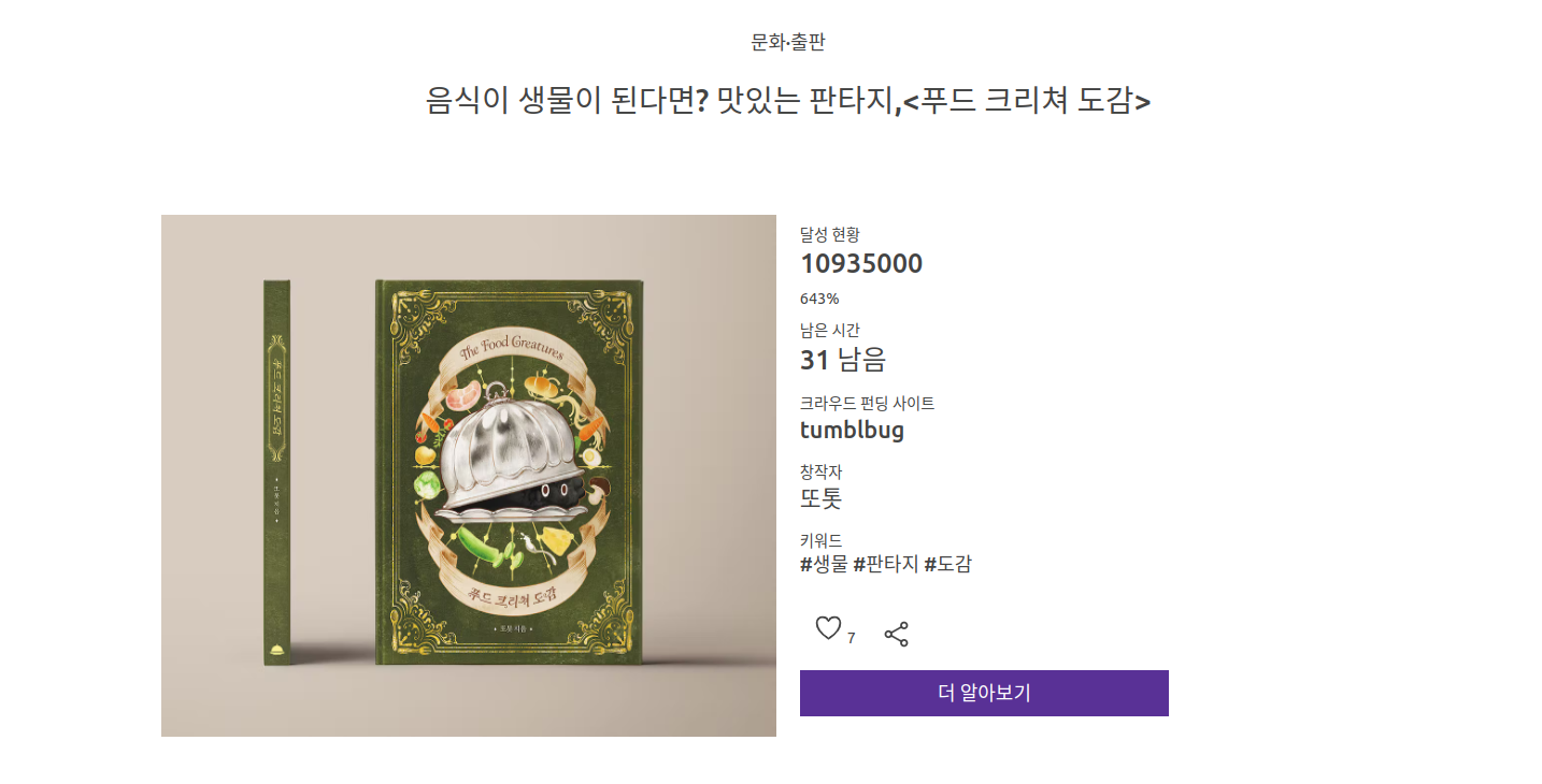 1. 내용 : 펀딩 리스트에서 사진이나 제목을 클릭하면 그 펀딩의 내용에 대해서 간단하게 알려주는 페이지이다. 찜과 공유하기, 더 알아보기를 할 수 있다.
