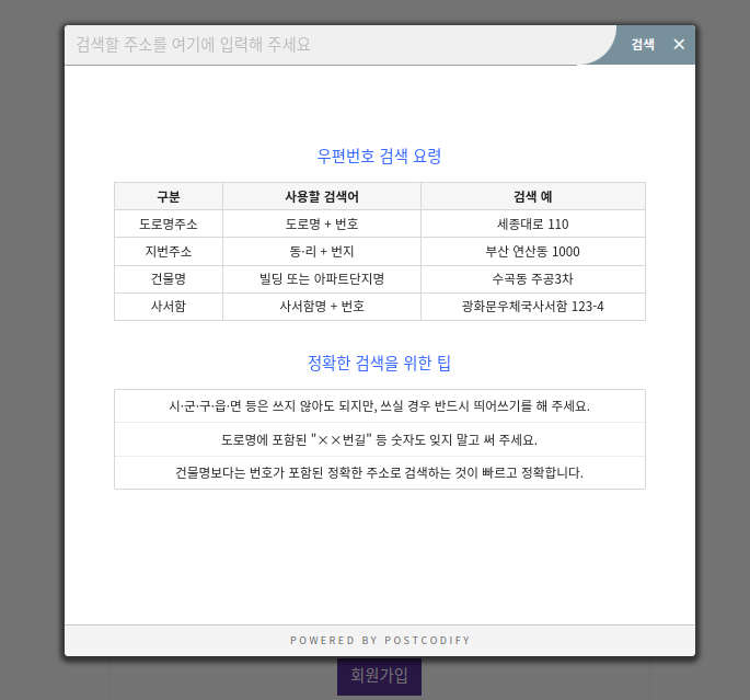 그리고 주소를 입력할 때는 주소입력 API를 이용하였는데 아래와 같이 모달창이 뜬다.