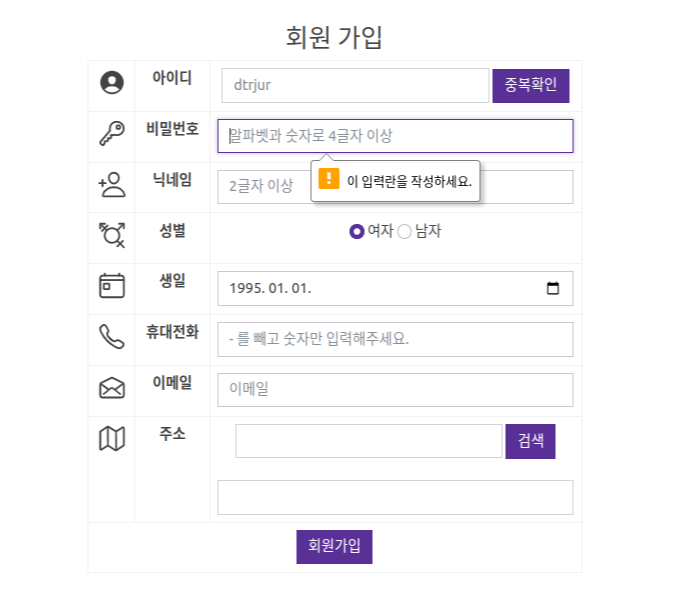 회원가입 화면에서는 아이디, 비밀번호, 닉네임, 성별, 생일, 휴대전화, 이메일, 주소를 받는다. 각각의 정보는 모두 required라서 입력하지 않고 회원가입 번호를 누르면 '이 입력란을 작성하세요.'라고 안내가 뜬다.