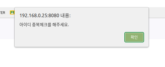만약 아이디 중복체크 버튼을 누르지 않고 그냥 넘어간다면 '아이디 중복체크를 해주세요.'라는 알럿창이 뜬다. 이에 대한 javascript 코드는 아래와 같다.