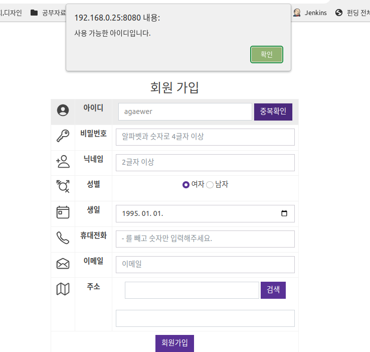 2. 과정 중 특이점 : 우편번호 찾기를 간단하게 구현하게 해주는 API를 찾아서 쉽게 넣을 수 있었다. 아이디 중복 체크는 이전 화면구현 때도 해봤었기 때문에 이번에도 그대로 적용하였다. 다음 번엔 validation을 적용해야겠다.