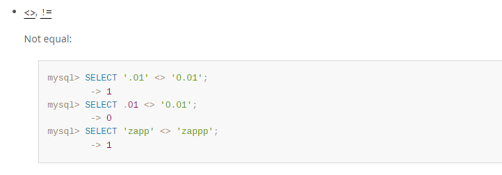 <>는 ANSI SQL에서 제시한 SQL-92 표준에 속하기 때문에 DBMS 모두에서 사용된다. !=도 대부분의 DBMS에서 지원하고 있으며 둘은 기능적으로는 동일하게 사용된다. 아래의 예시를 살펴보면 MySQL에선 두 가지를 동일하게 지원한다는 것을 알 수 있다.