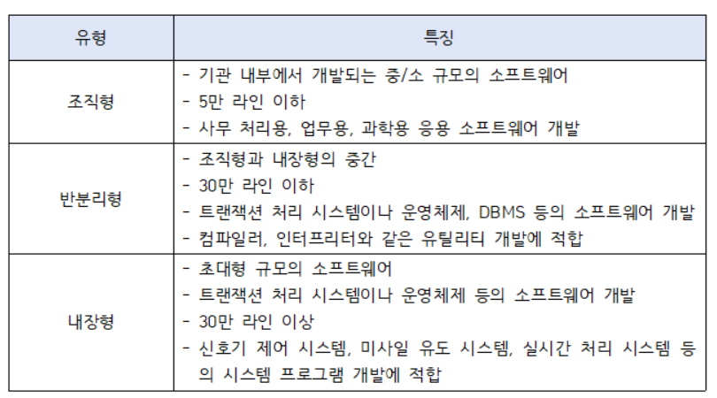 - 프로젝트 요소 : 제품 복잡도, 시스템 크기, 요구되는 신뢰도