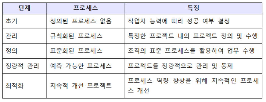 - 소프트웨어 개발 조직의 업무 능력 및 조직의 성숙도를 평가하는 모델