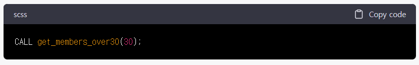 2) 호출 : 위에서 생성한 "get_members_over30" 프로시저를 호출하여 "age"가 30세 이상인 회원들의 정보를 가져 오기